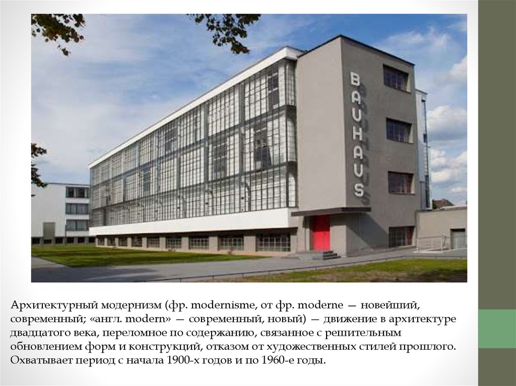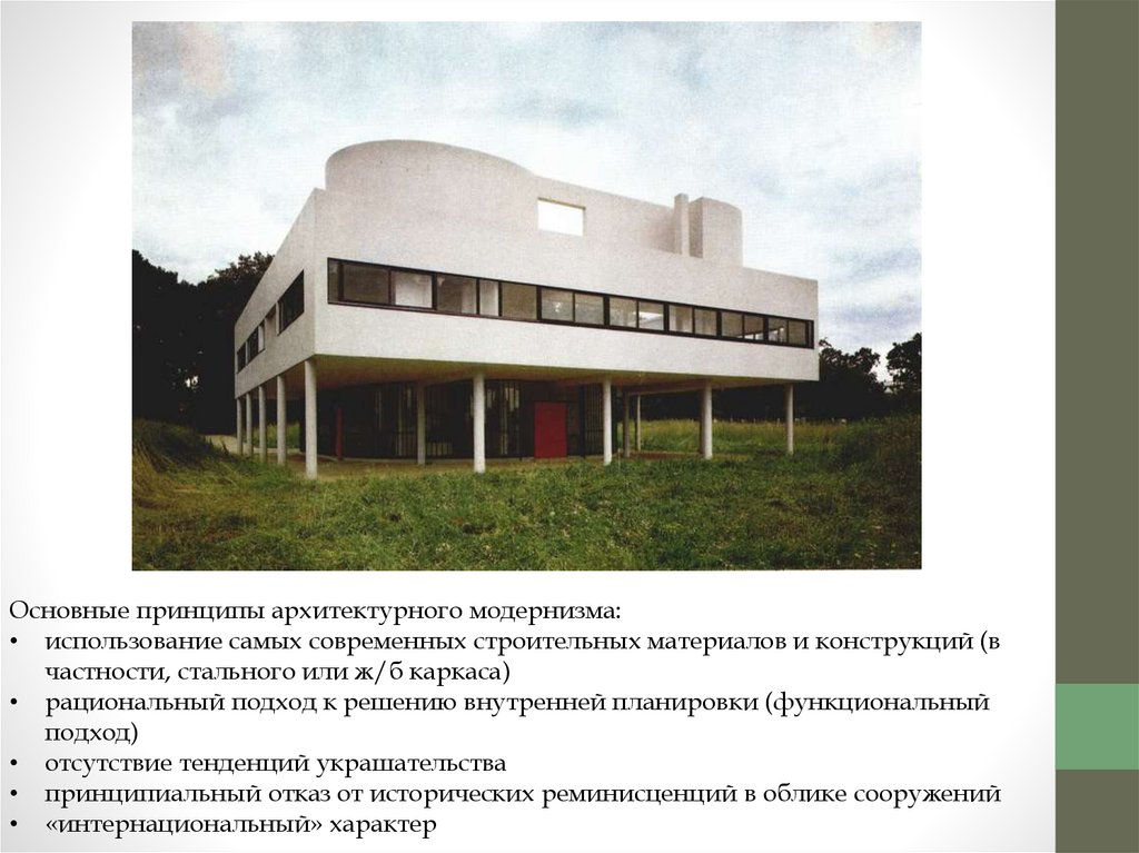 Основные принципы архитектурного модернизма:• использование самых современных строительных материалов и конструкций (в