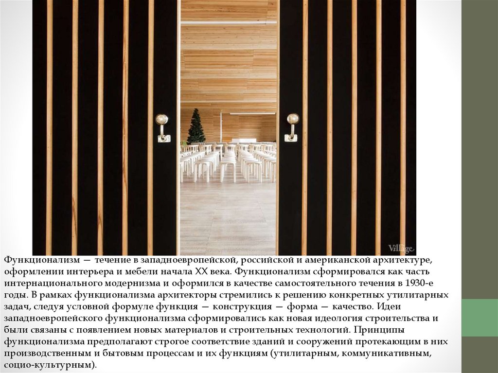 Функционализм — течение в западноевропейской, российской и американской архитектуре,оформлении интерьера и мебели начала ХХ века. Функционализм сформировался как часть