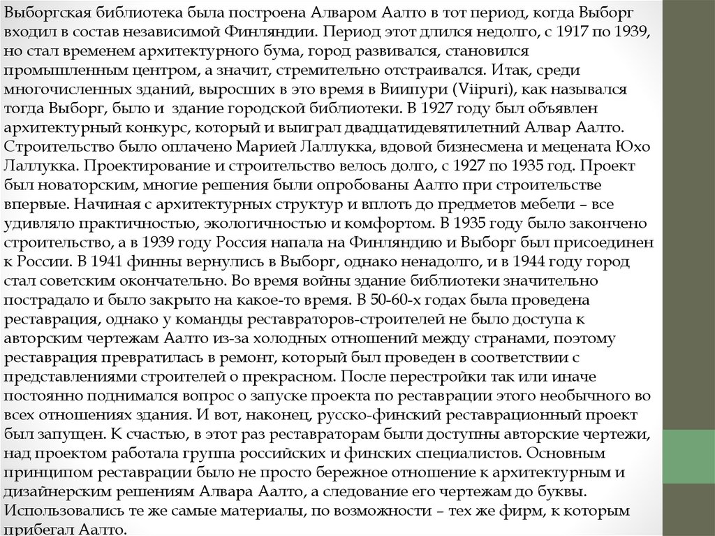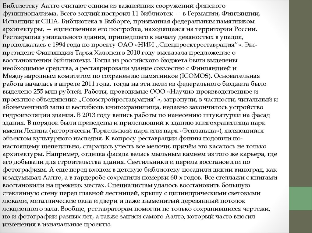 Библиотеку Аалто считают одним из важнейших сооружений финскогофункционализма. Всего зодчий построил 11 библиотек — в Германии, Финляндии,