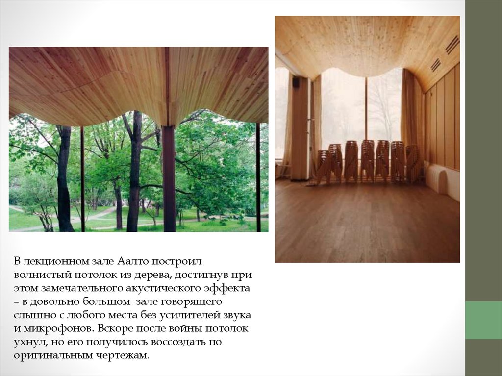 В лекционном зале Аалто построилволнистый потолок из дерева, достигнув при