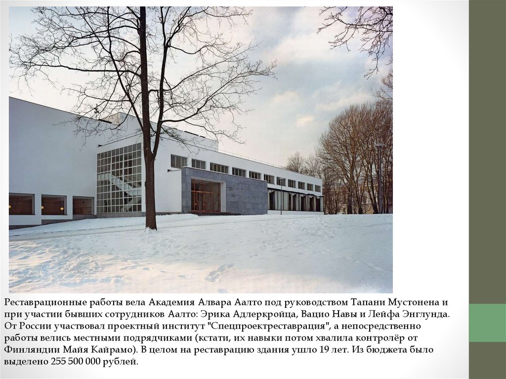 необходимые средства, а реставрировали здание совместно с Финляндией и