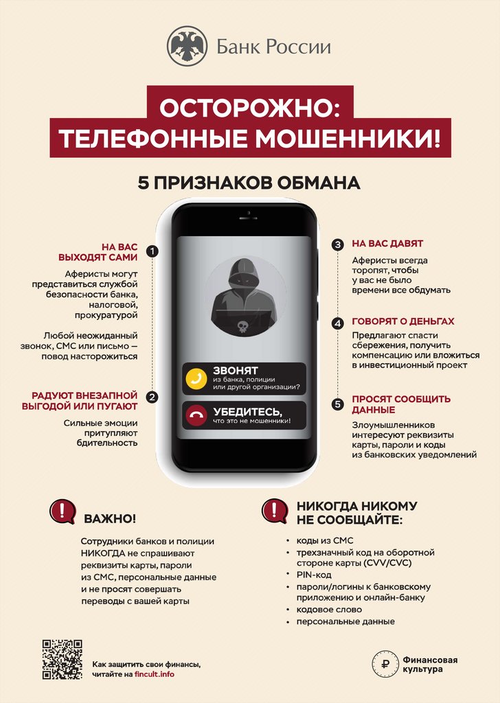 Банк России. Осторожно: телефонные мошенники! 5 признаков обмана