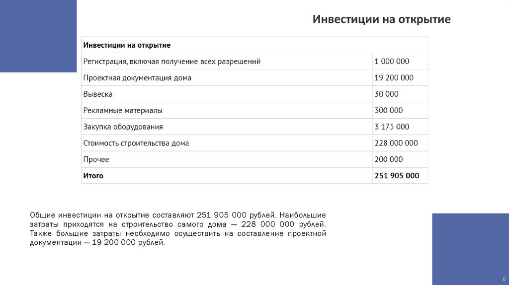 Инвестиции на открытиеОбщие инвестиции на открытие составляют 251 905 000 рублей. Наибольшие