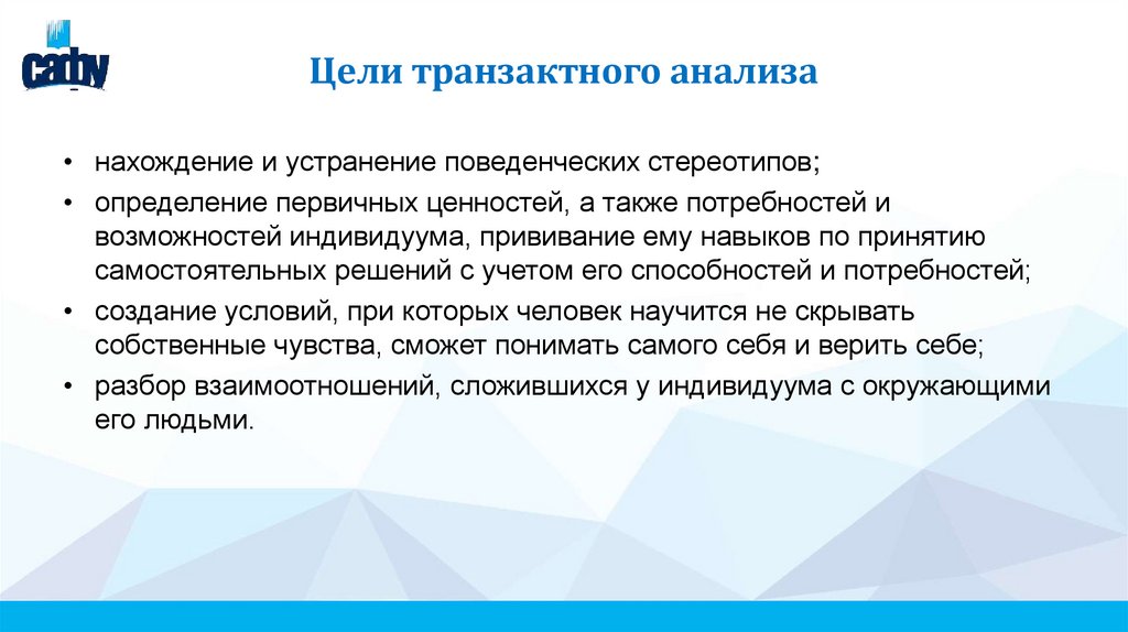 Цели транзактного анализа• нахождение и устранение поведенческих стереотипов;