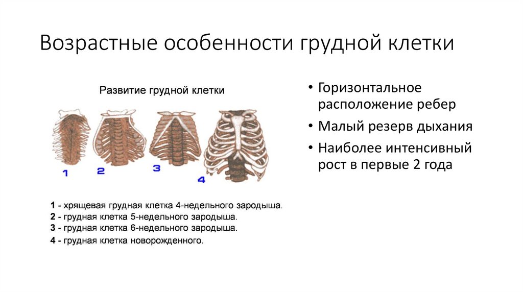 Возрастные особенности грудной клетки• Горизонтальное