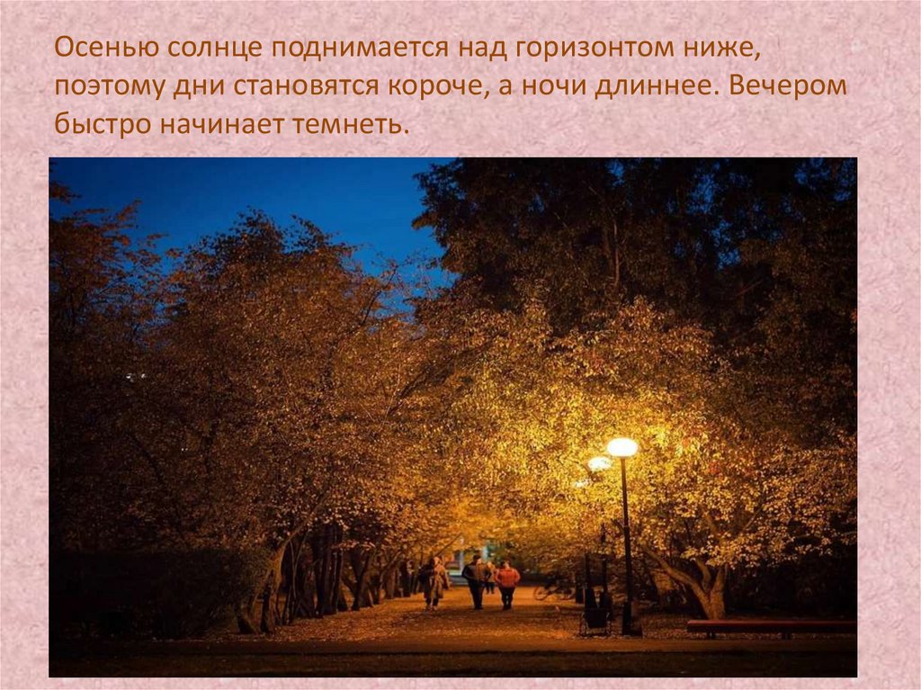 Осенью солнце поднимается над горизонтом ниже,поэтому дни становятся короче, а ночи длиннее. Вечером