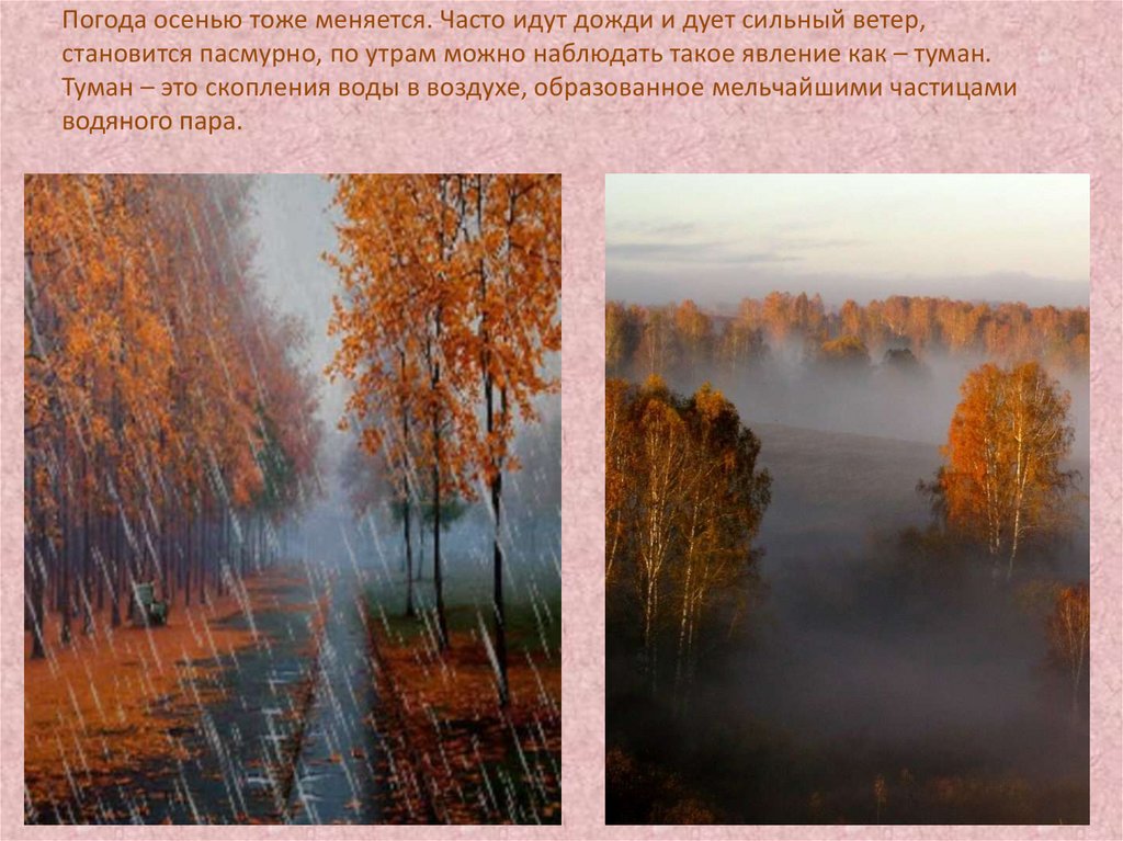 Погода осенью тоже меняется. Часто идут дожди и дует сильный ветер,становится пасмурно, по утрам можно наблюдать такое явление как – туман.
