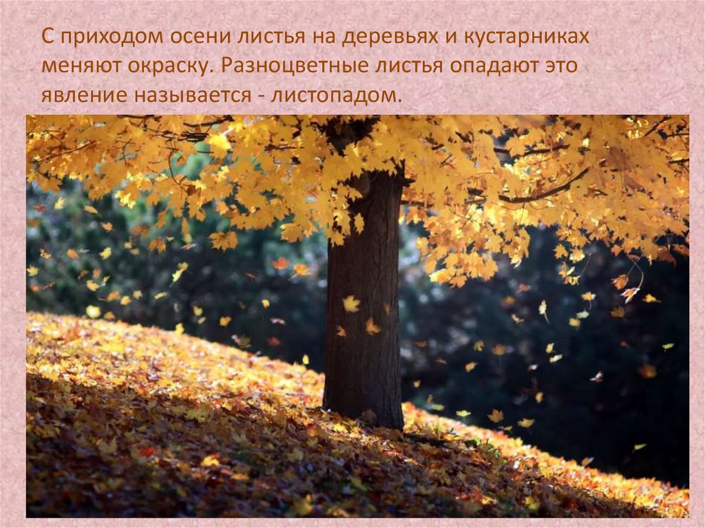 С приходом осени листья на деревьях и кустарникахменяют окраску. Разноцветные листья опадают это