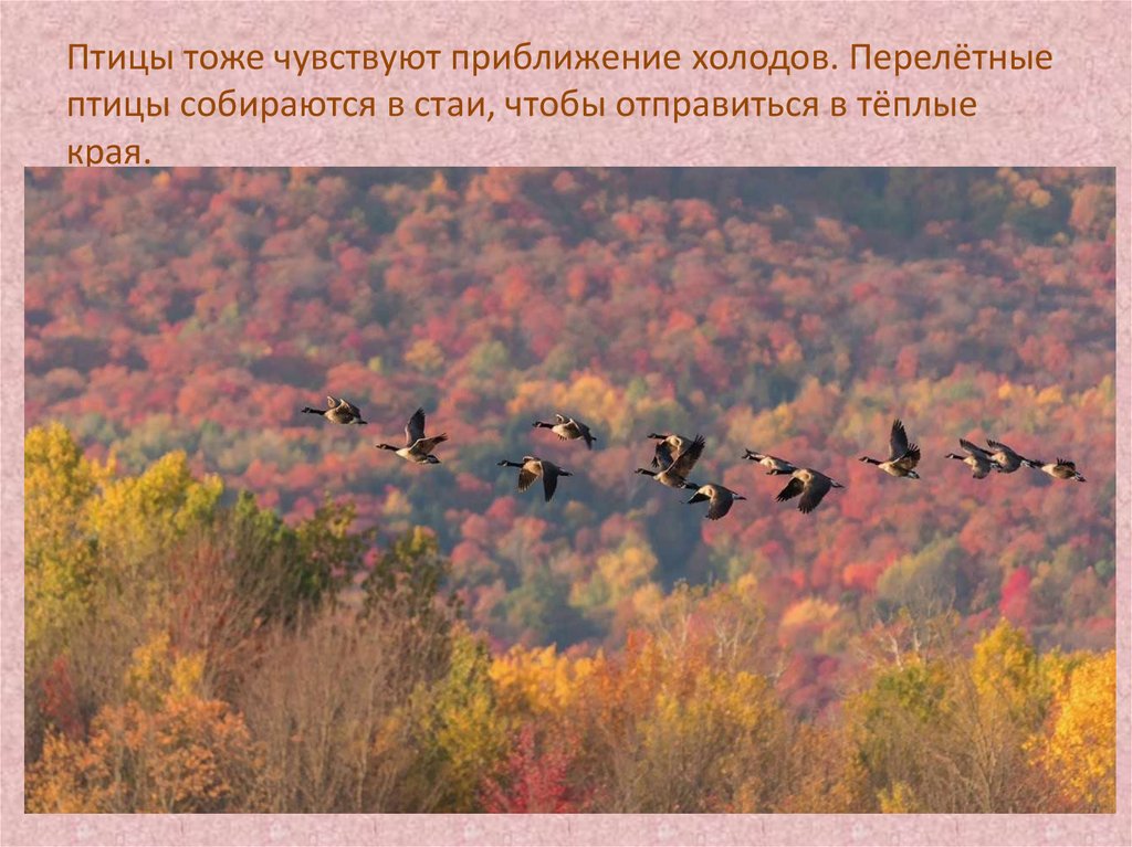 Птицы тоже чувствуют приближение холодов. Перелётныептицы собираются в стаи, чтобы отправиться в тёплые