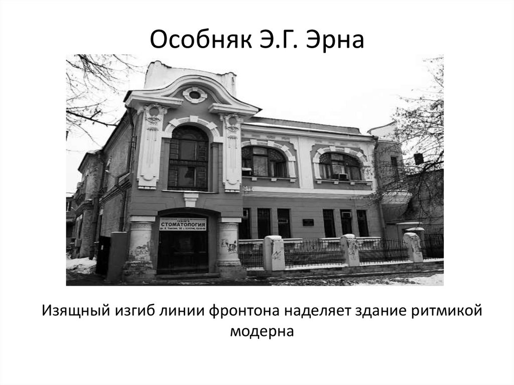 Особняк Э.Г. ЭрнаИзящный изгиб линии фронтона наделяет здание ритмикой