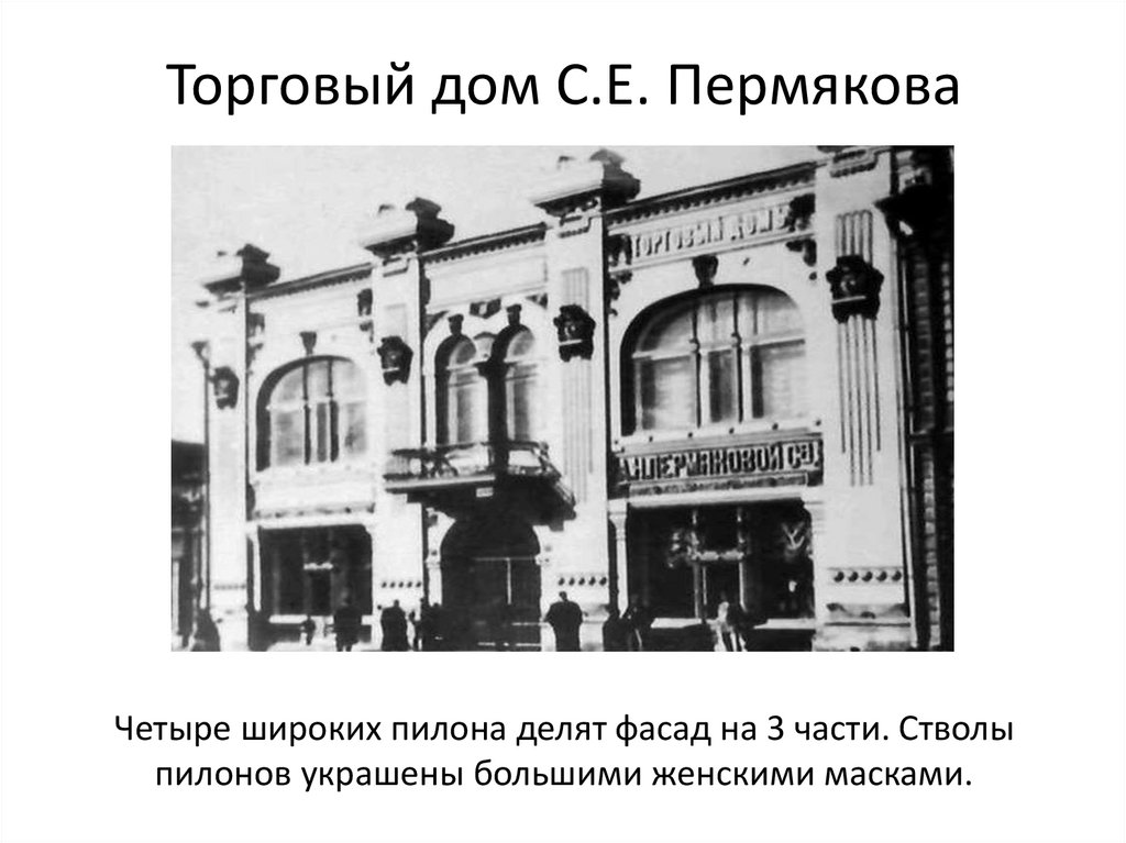 Торговый дом С.Е. ПермяковаЧетыре широких пилона делят фасад на 3 части. Стволы