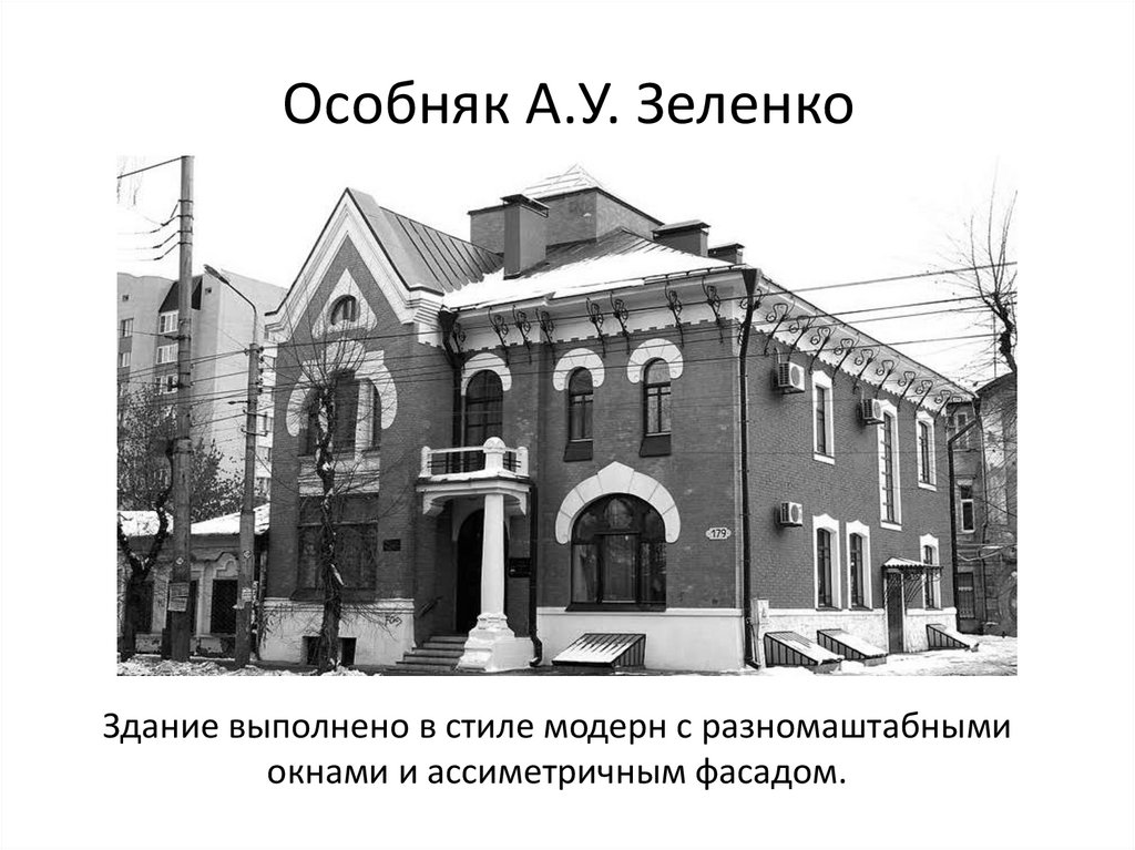 Особняк А.У. ЗеленкоЗдание выполнено в стиле модерн с разномаштабными