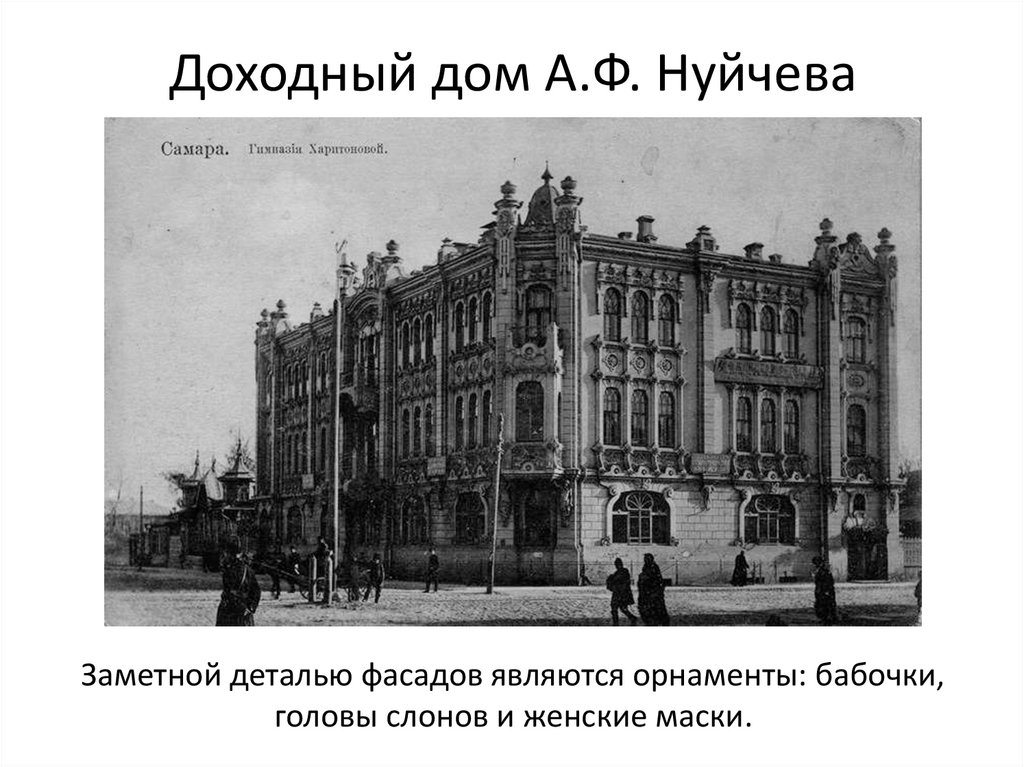 Доходный дом А.Ф. НуйчеваЗаметной деталью фасадов являются орнаменты: бабочки,