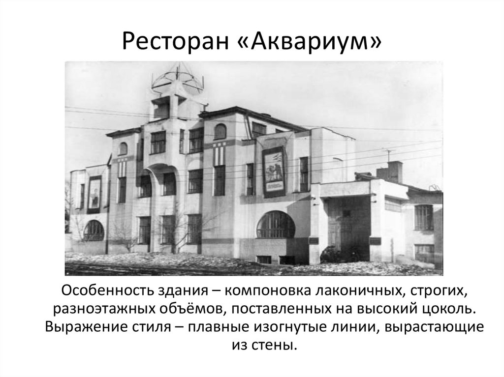 Ресторан «Аквариум»Особенность здания – компоновка лаконичных, строгих,