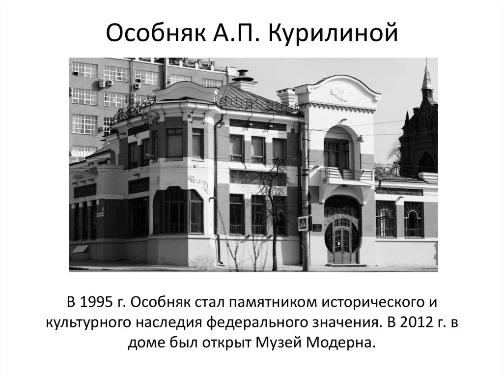 Особняк А.П. КурилинойВ 1995 г. Особняк стал памятником исторического и