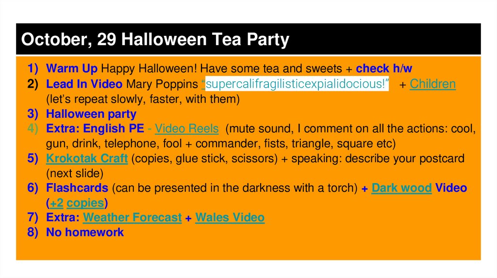 October, 29 Halloween Tea Party1) Warm Up Happy Halloween! Have some tea and sweets + check h/w