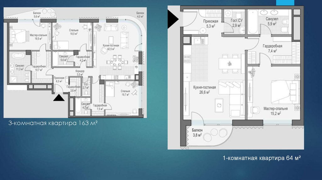 3-комнатная квартира 163 м²1-комнатная квартира 64 м²