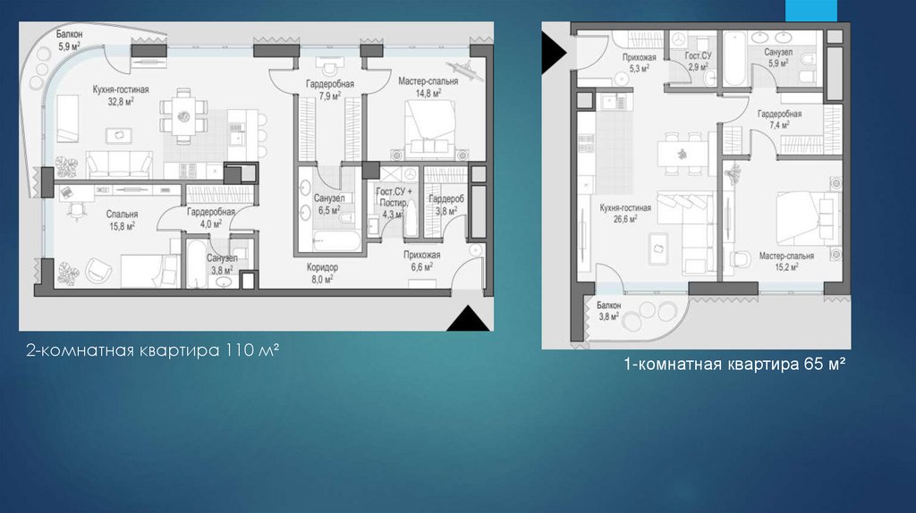 2-комнатная квартира 110 м²1-комнатная квартира 65 м²