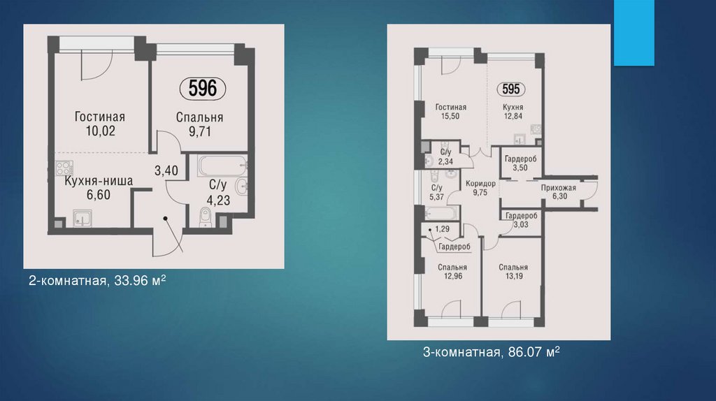 2-комнатная, 33.96 м23-комнатная, 86.07 м2