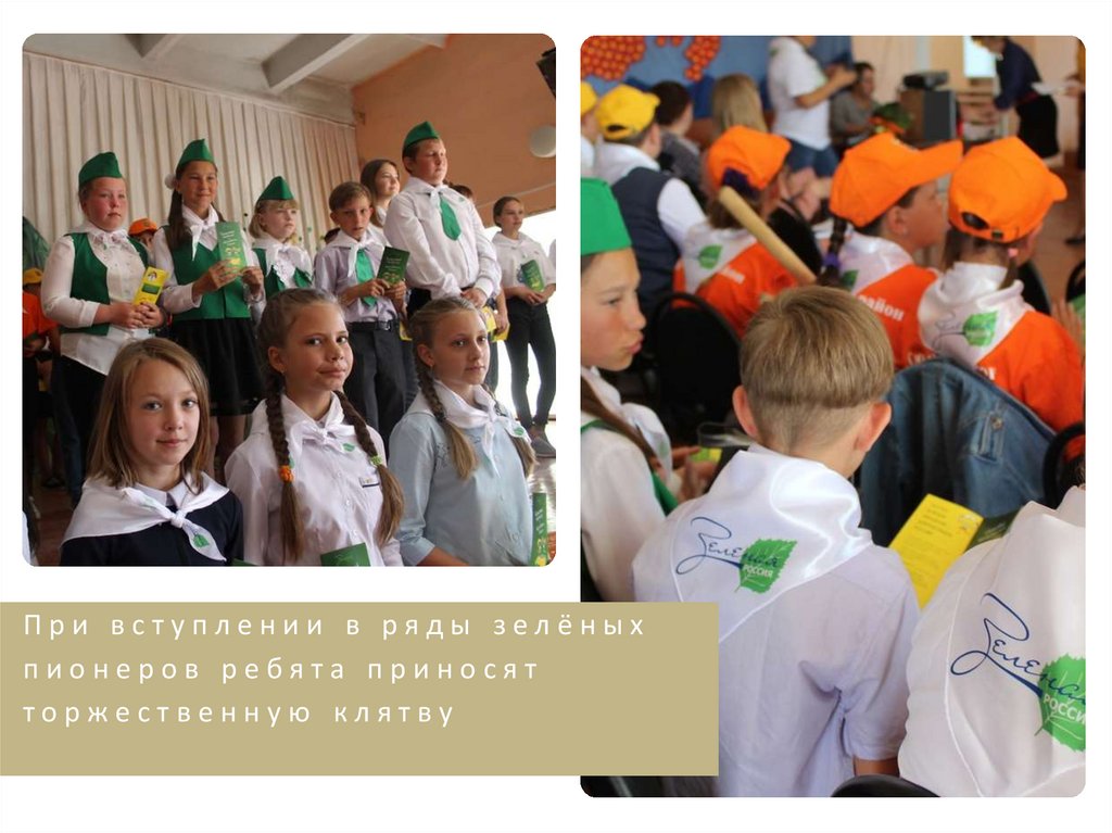 При вступлении в ряды зелёныхпионеров ребята приносят