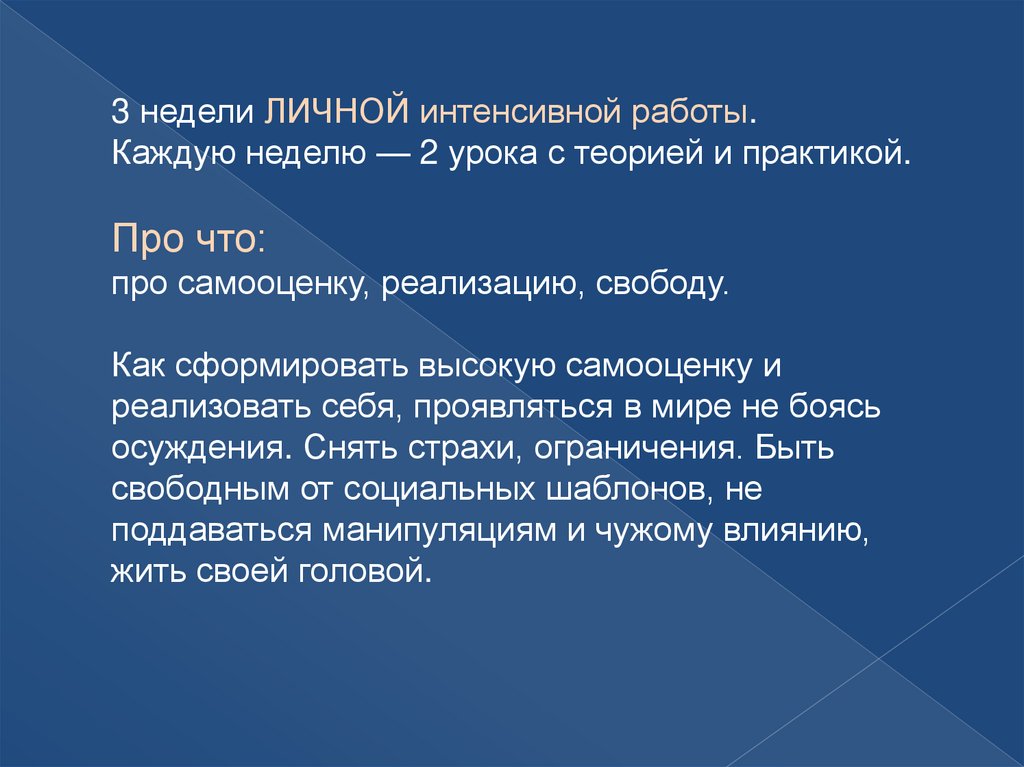 3 недели ЛИЧНОЙ интенсивной работы.Каждую неделю — 2 урока с теорией и практикой.