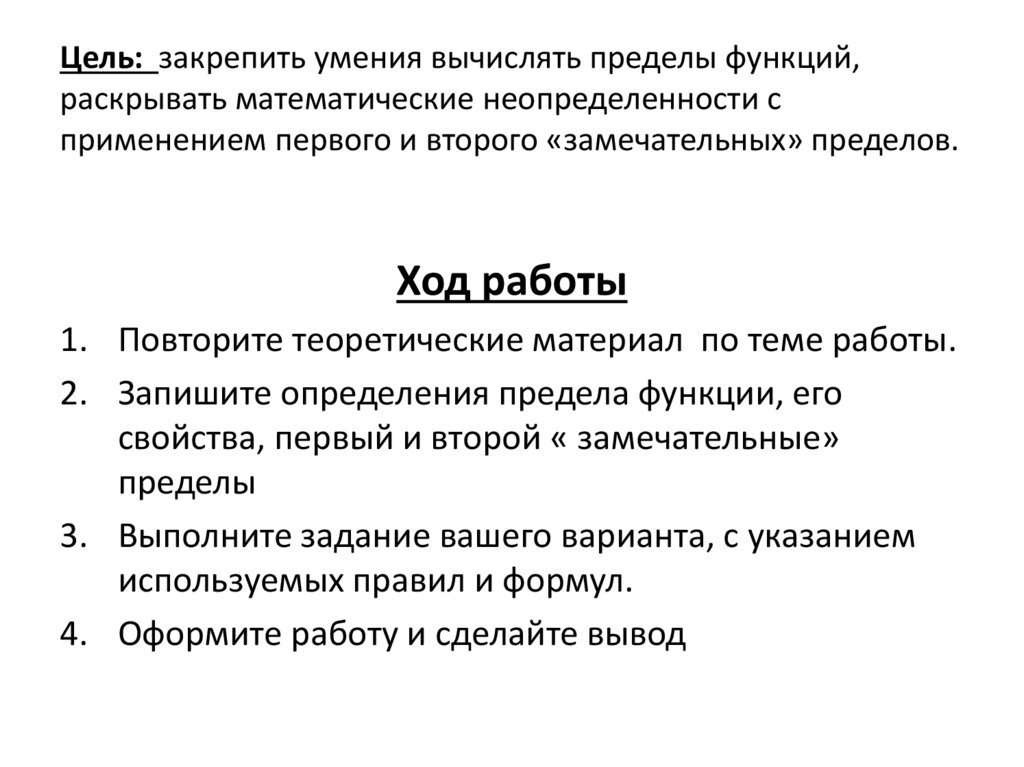 Цель: закрепить умения вычислять пределы функций,раскрывать математические неопределенности с