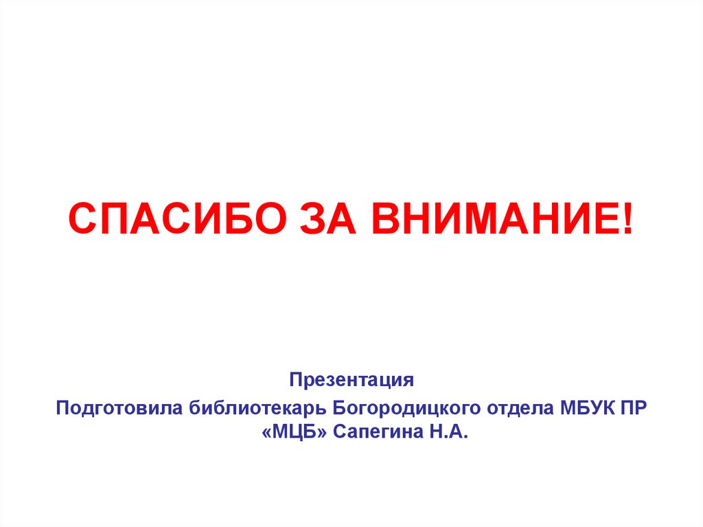 Подготовила библиотекарь Богородицкого отдела МБУК ПР