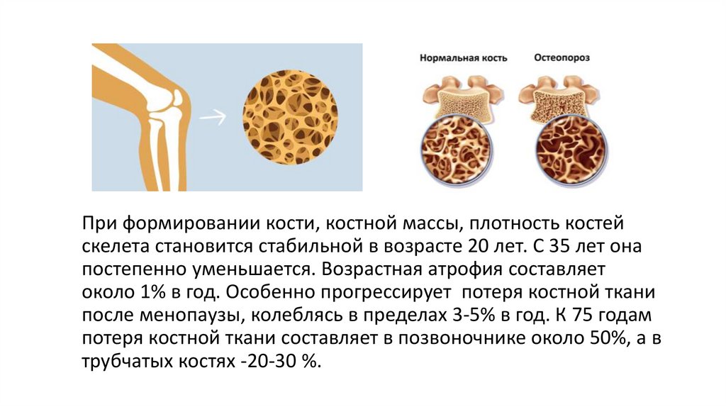 При формировании кости, костной массы, плотность костейскелета становится стабильной в возрасте 20 лет. С 35 лет она