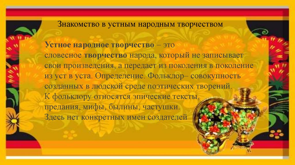 Знакомство в устным народным творчествомУстное народное творчество – это