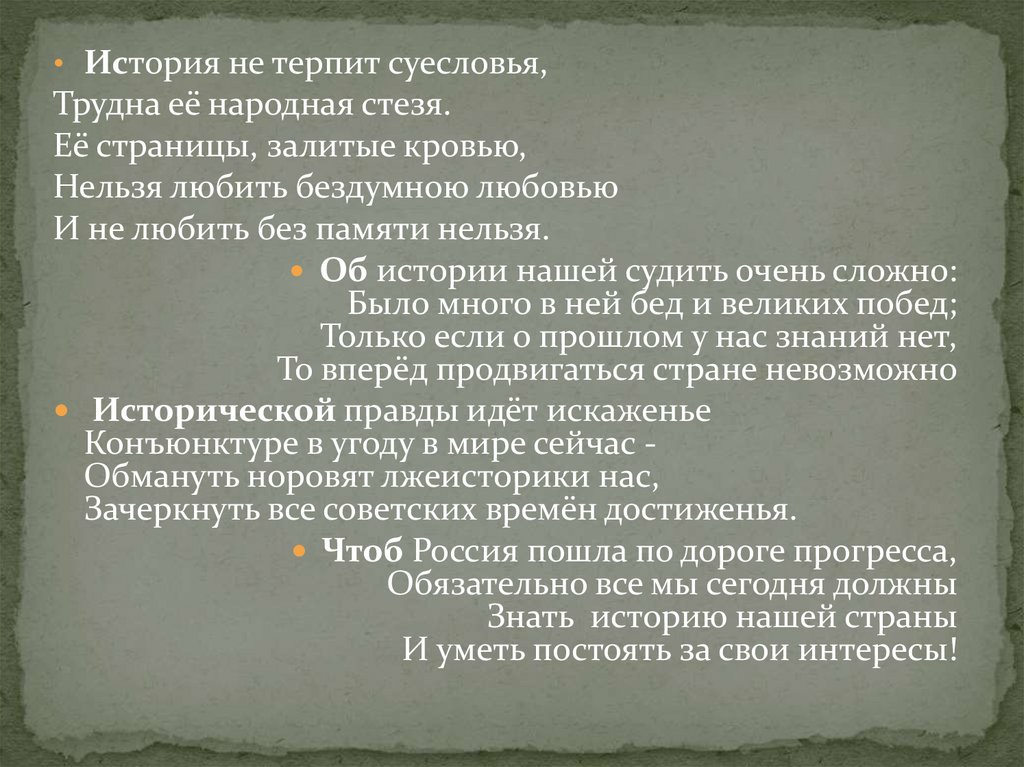 • История не терпит суесловья,Трудна её народная стезя.