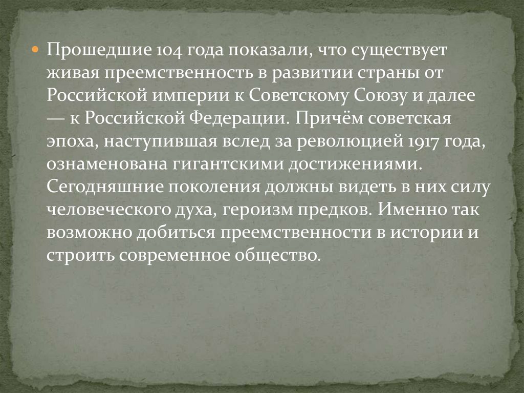 Прошедшие 104 года показали, что существуетживая преемственность в развитии страны от