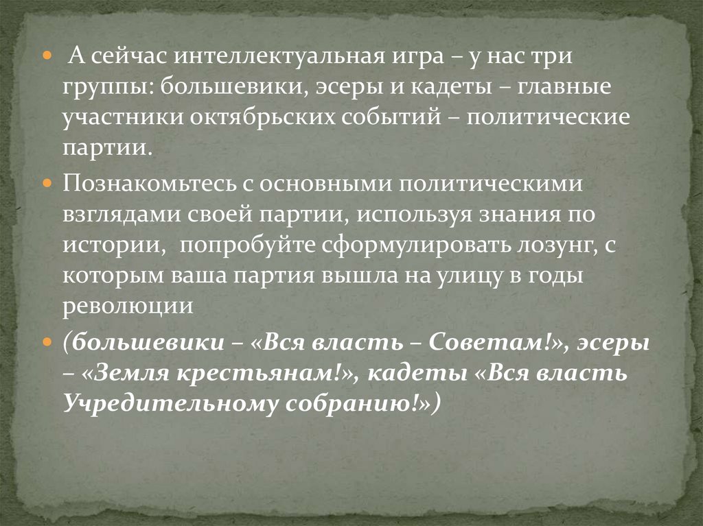 А сейчас интеллектуальная игра – у нас тригруппы: большевики, эсеры и кадеты – главные