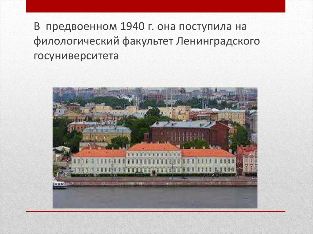 В предвоенном 1940 г. она поступила нафилологический факультет Ленинградского