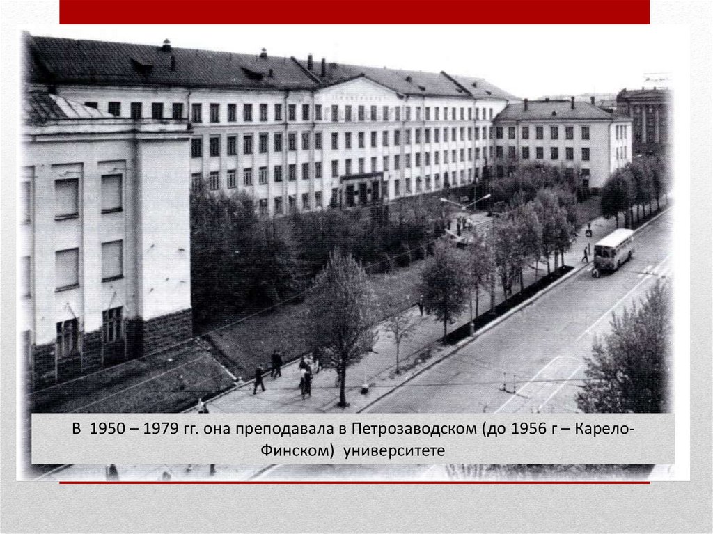 В 1950 – 1979 гг. она преподавала в Петрозаводском (до 1956 г – КарелоФинском) университете6.