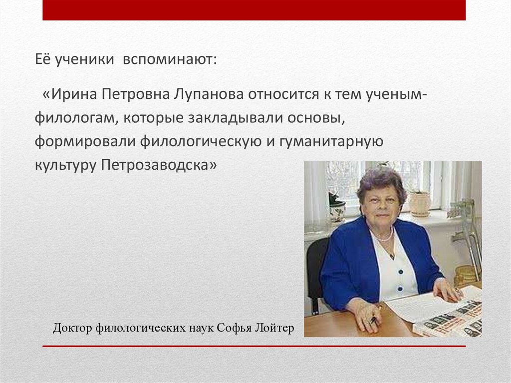 Её ученики вспоминают:«Ирина Петровна Лупанова относится к тем ученымфилологам, которые закладывали основы,