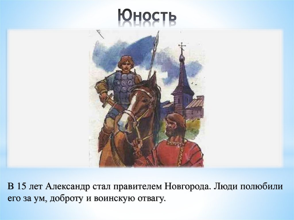 В 15 лет Александр стал правителем Новгорода. Люди полюбилиего за ум, доброту и воинскую отвагу.