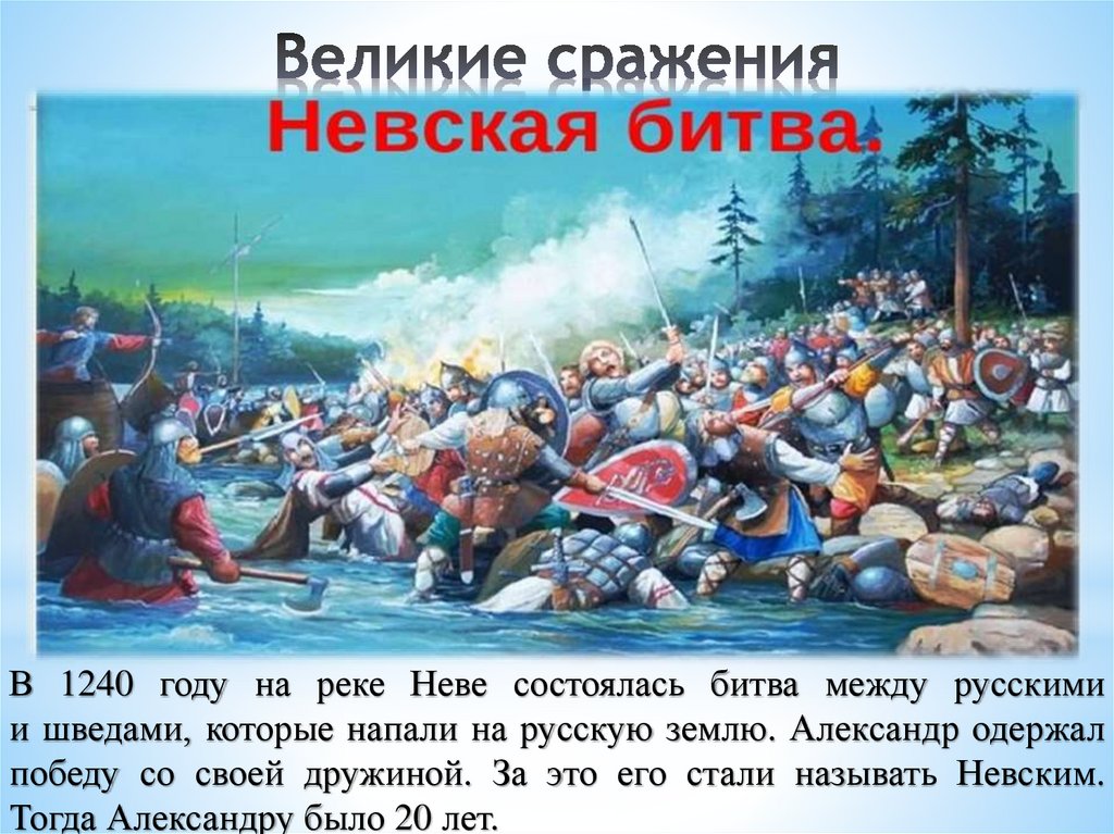 В 1240 году на реке Неве состоялась битва между русскимии шведами, которые напали на русскую землю. Александр одержал