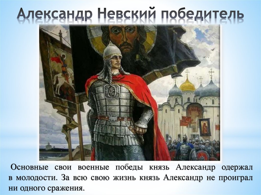 Основные свои военные победы князь Александр одержалв молодости. За всю свою жизнь князь Александр не проиграл