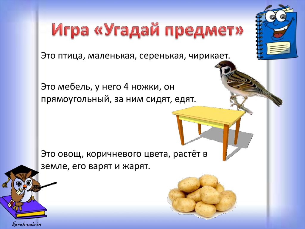 Это птица, маленькая, серенькая, чирикает.Это мебель, у него 4 ножки, он