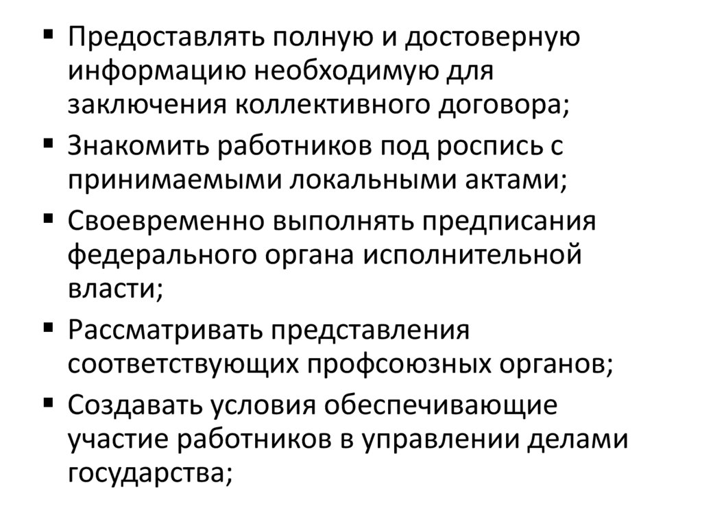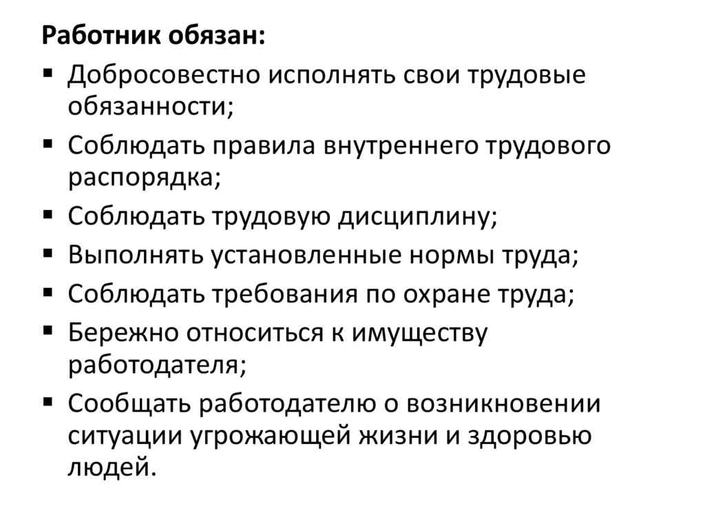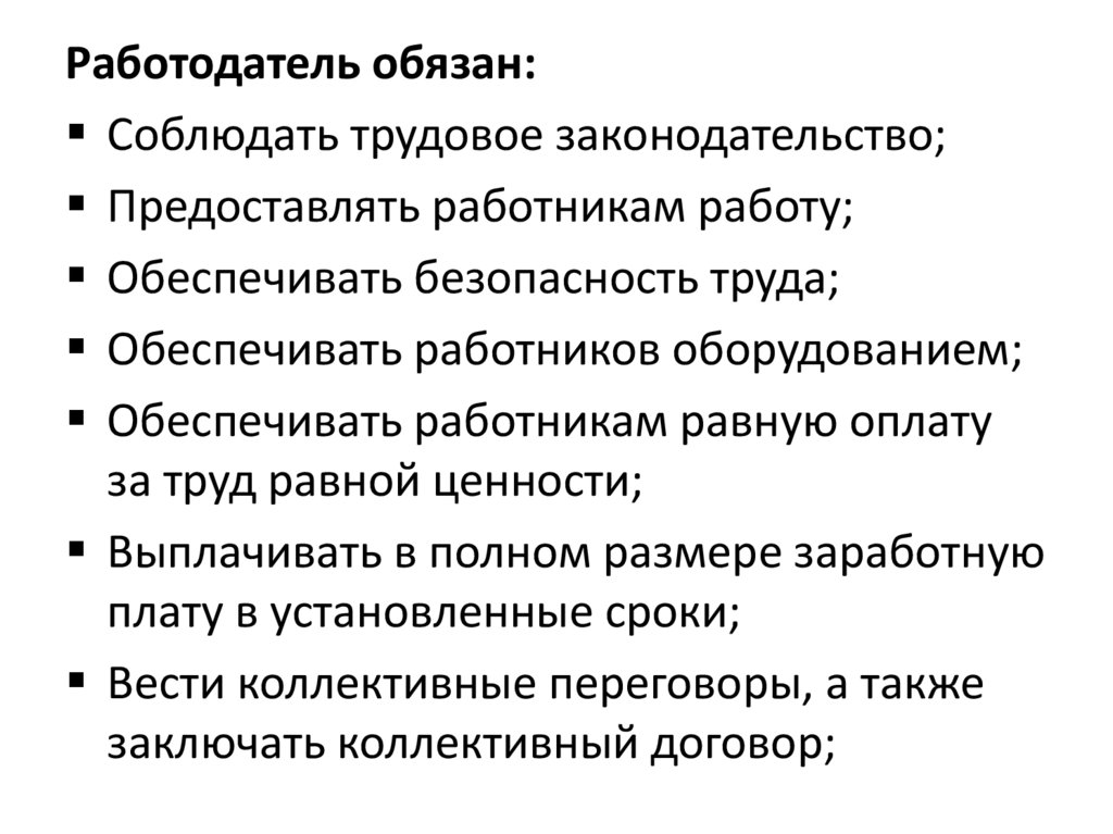 Работодатель обязан:Соблюдать трудовое законодательство;
