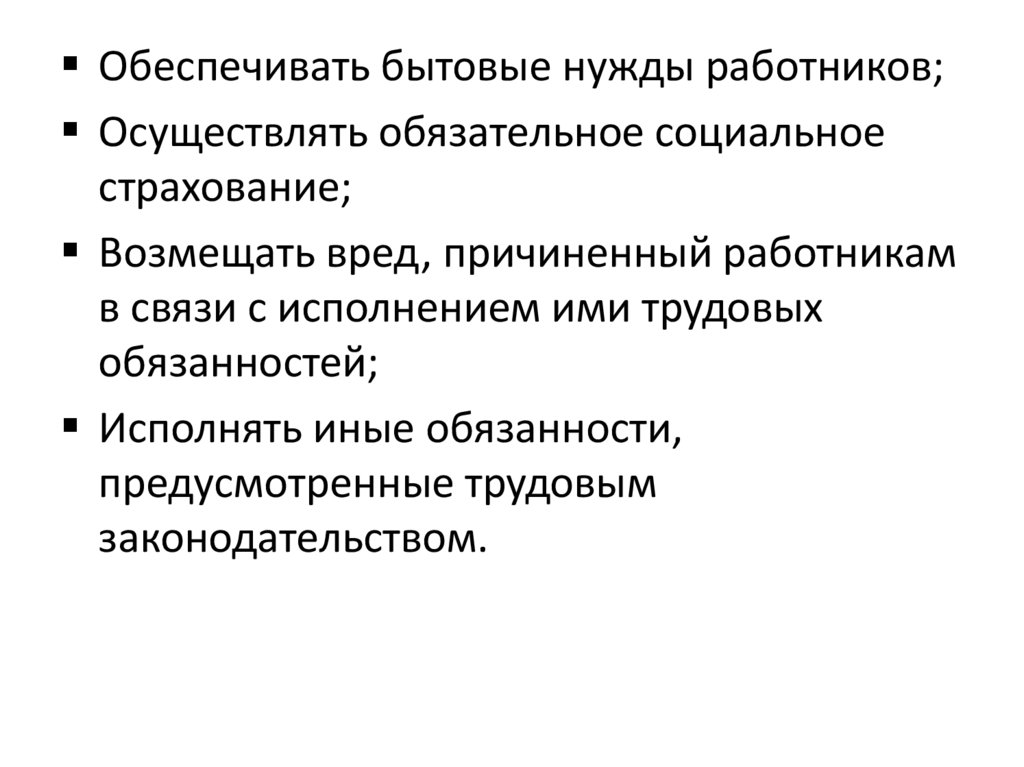 Обеспечивать бытовые нужды работников;Осуществлять обязательное социальное
