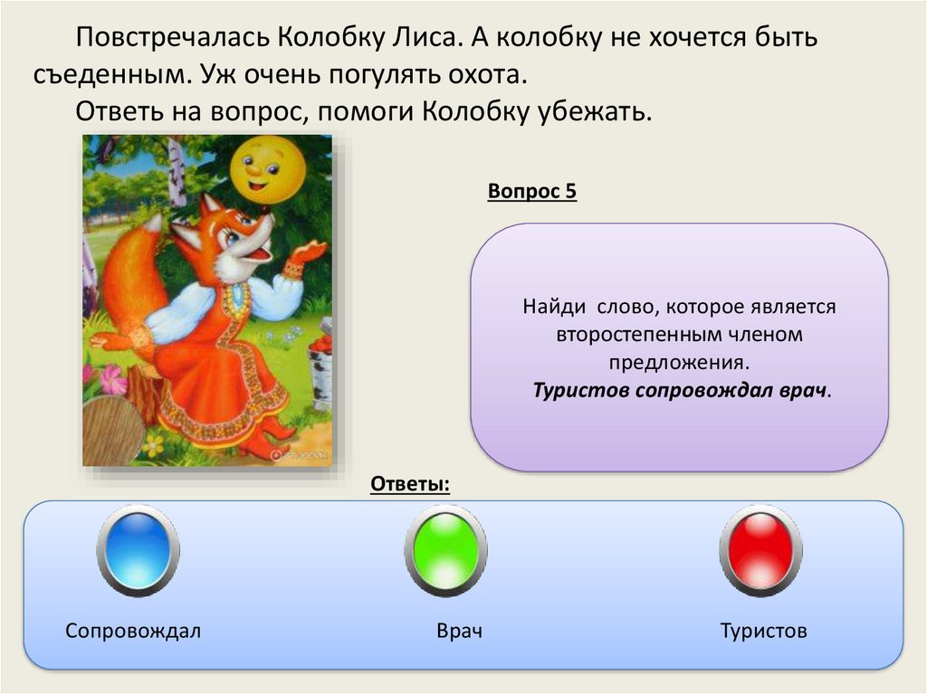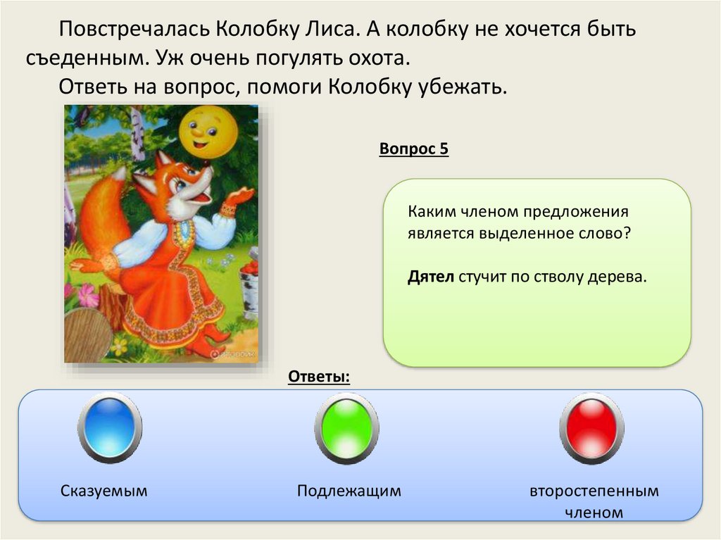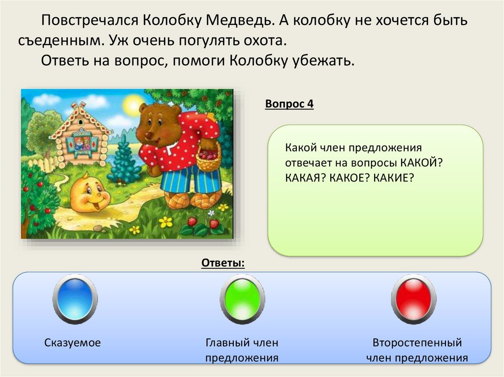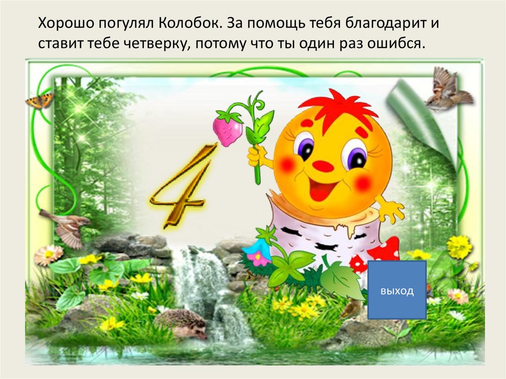 Хорошо погулял Колобок. За помощь тебя благодарит иставит тебе четверку, потому что ты один раз ошибся.