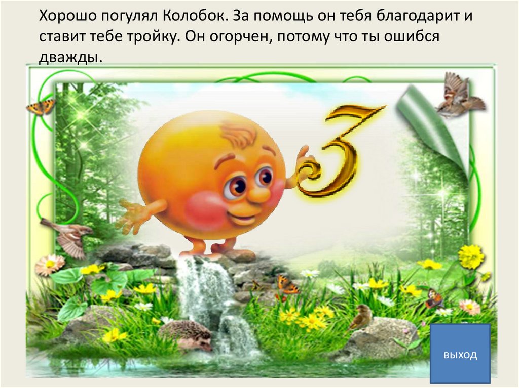 Хорошо погулял Колобок. За помощь он тебя благодарит иставит тебе тройку. Он огорчен, потому что ты ошибся