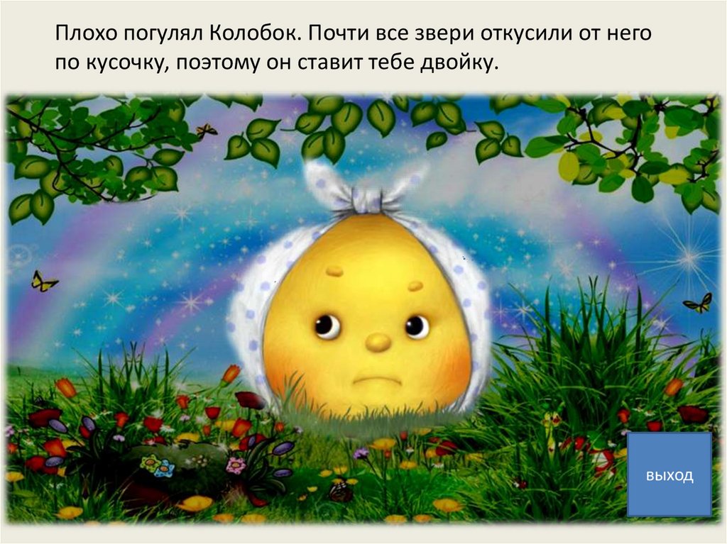 Плохо погулял Колобок. Почти все звери откусили от негопо кусочку, поэтому он ставит тебе двойку.