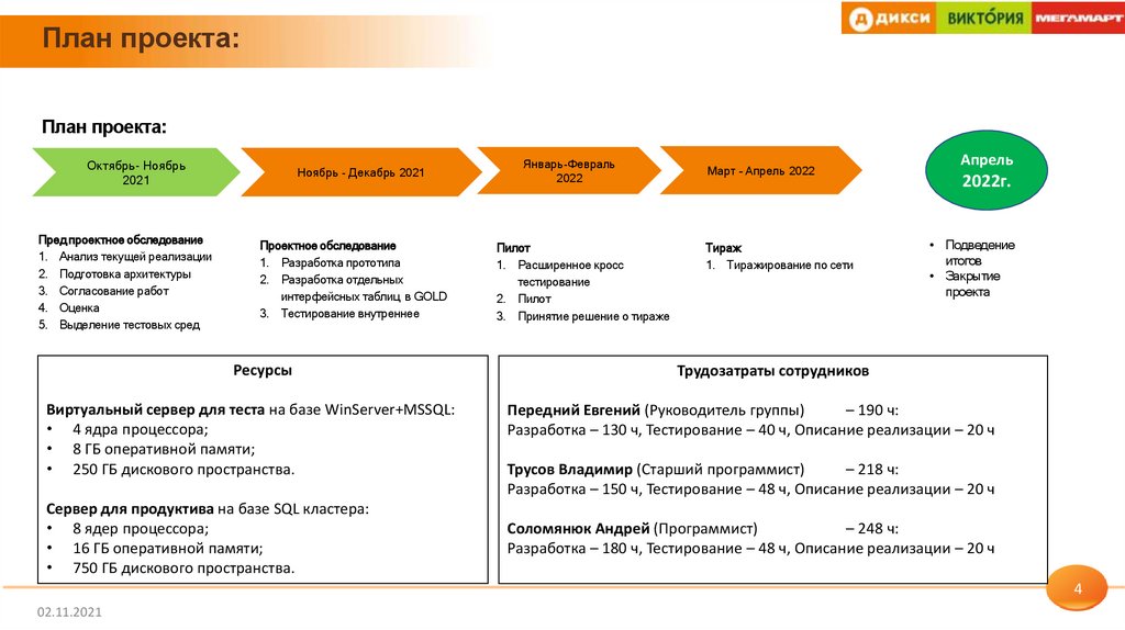 Разработка – 180 ч, Тестирование – 48 ч, Описание реализации – 20 ч