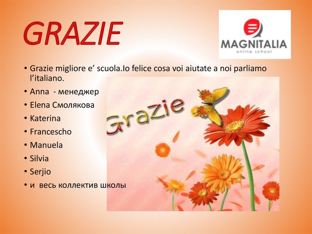 GRAZIE• Grazie migliore e’ scuola.Io felice cosa voi aiutate a noi parliamo