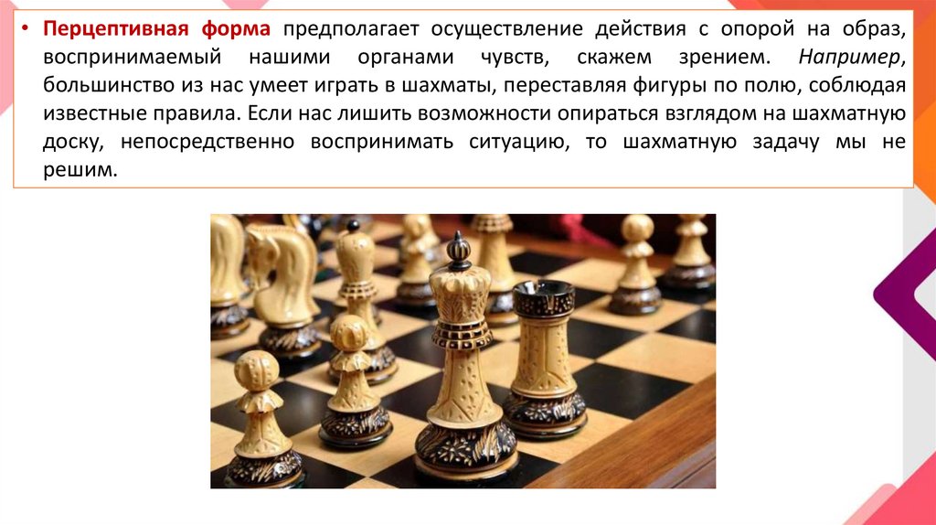• Перцептивная форма предполагает осуществление действия с опорой на образ,воспринимаемый нашими органами чувств, скажем зрением. Например,
