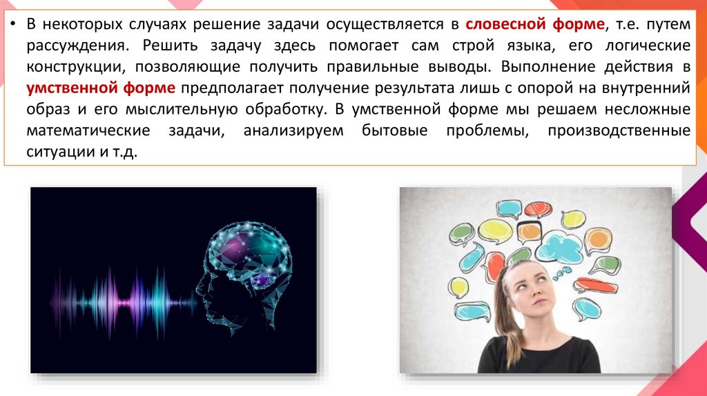 • В некоторых случаях решение задачи осуществляется в словесной форме, т.е. путемрассуждения. Решить задачу здесь помогает сам строй языка, его логические