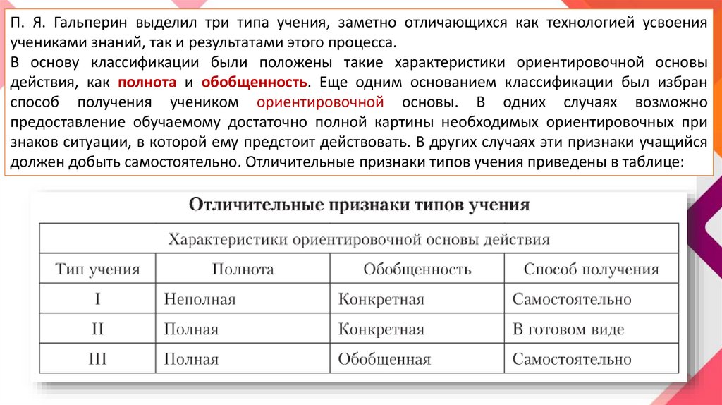 П. Я. Гальперин выделил три типа учения, заметно отличающихся как технологией усвоенияучениками знаний, так и результатами этого процесса.