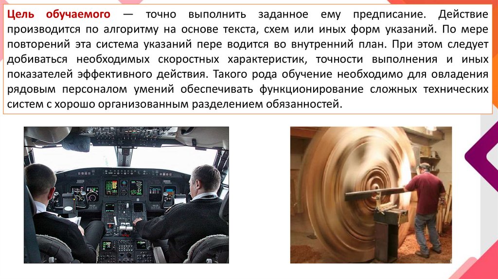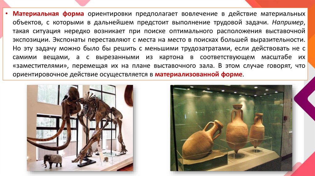 • Материальная форма ориентировки предполагает вовлечение в действие материальныхобъектов, с которыми в дальнейшем предстоит выполнение трудовой задачи. Например,